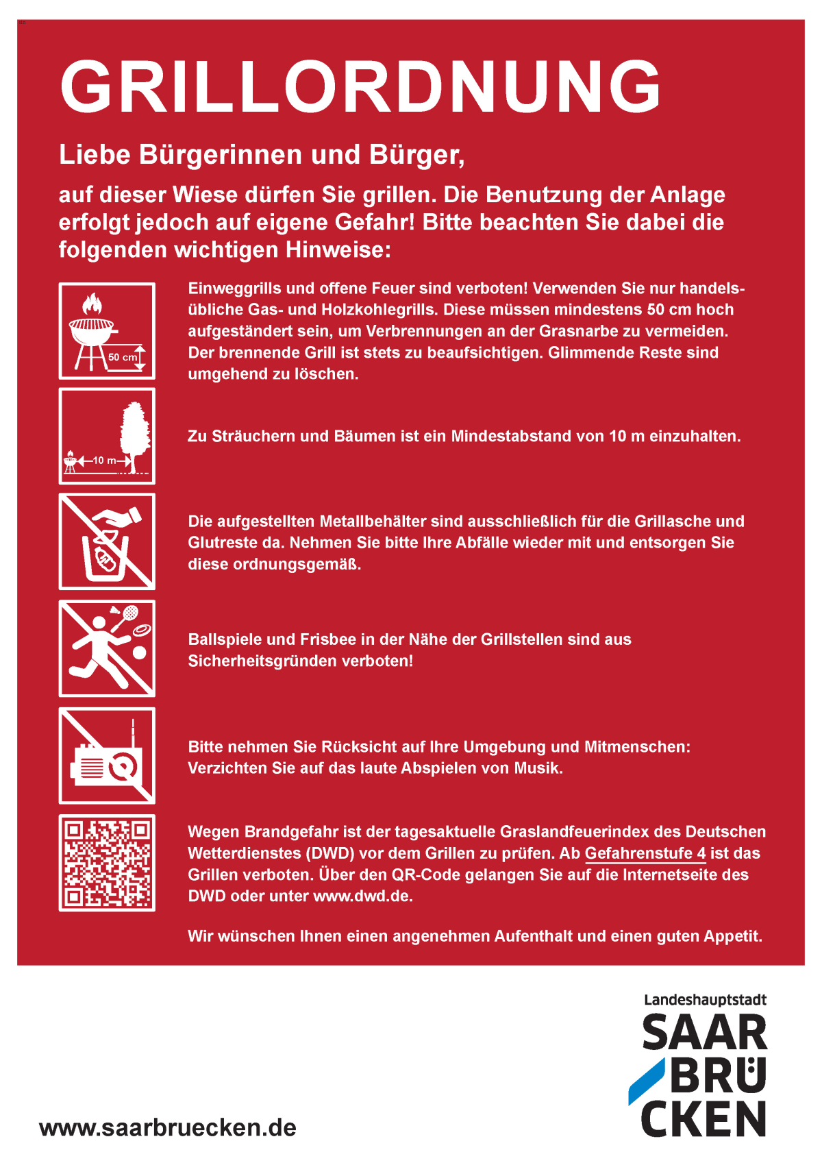 Wegen Brandgefahr ist der tagesaktuelle Graslandfeuerindex des Deutschen Wetterdienstes (DWD) vor dem Grillen zu prüfen. Ab Gefahrenstufe 4 ist das Grillen verboten.