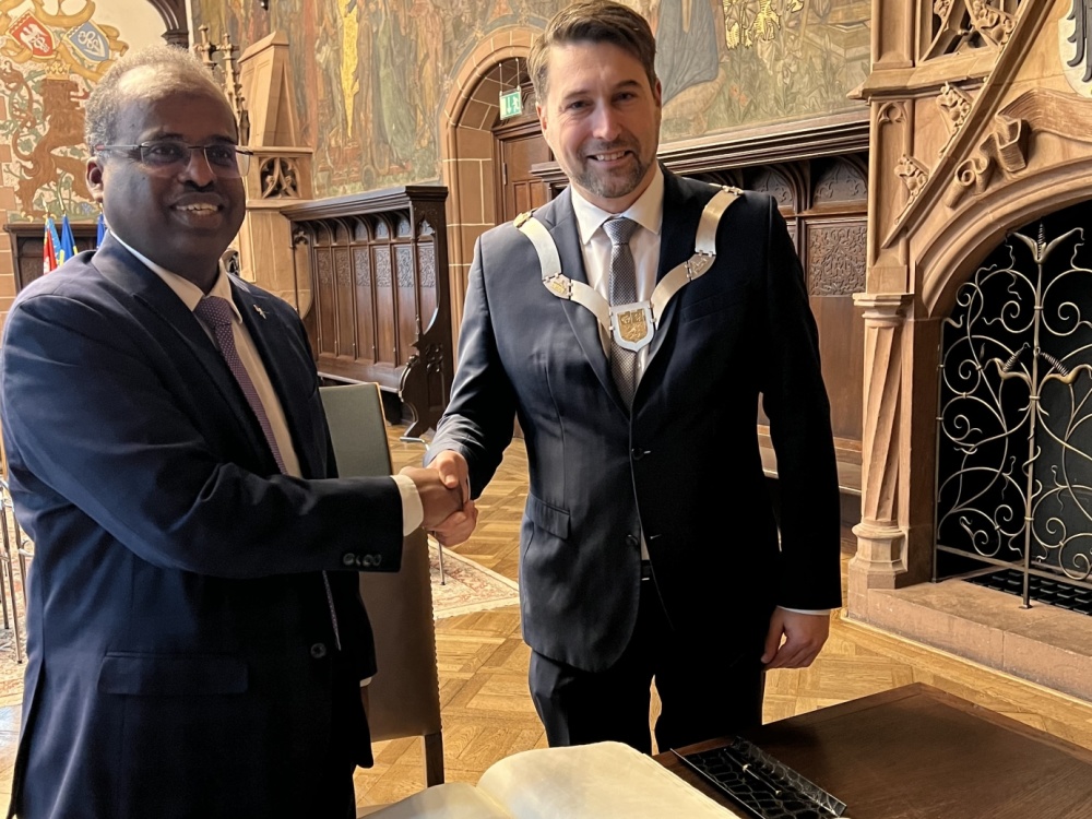 Der Botschafter von Dschibuti, S.E. Yacin Houssein Doualé, hat sich am 26. Januar bei seinem Besuch im Saarbrücker Rathaus in das Goldene Buch der Landeshauptstadt eingetragen - LHS