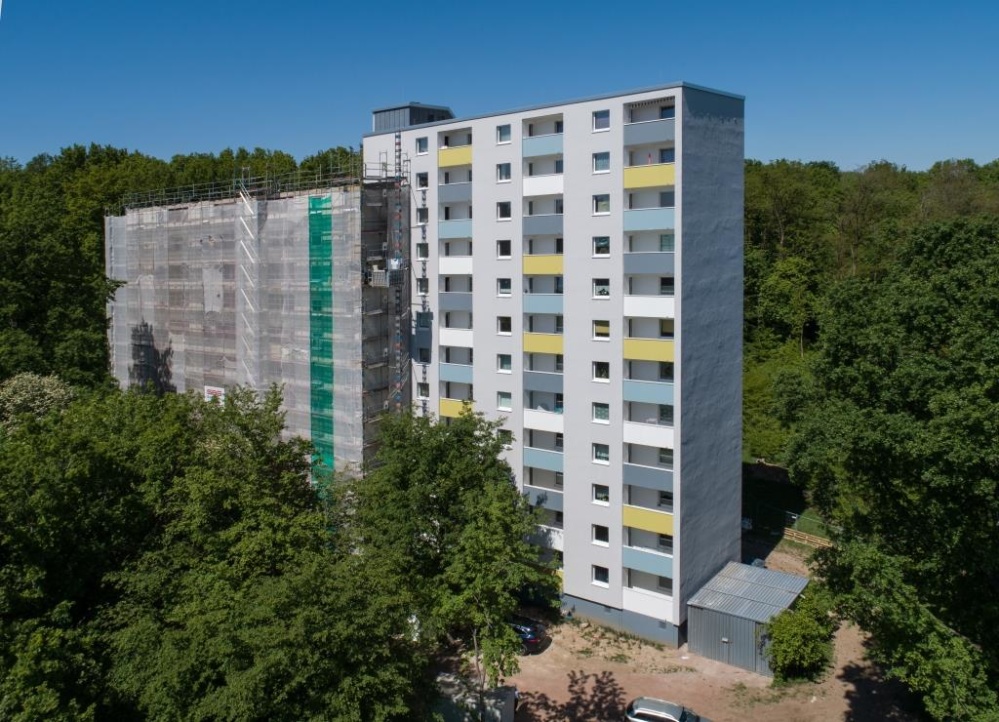 2019 startete die energetische Sanierung des zweigliedrigen Hochhauses Mecklenburgring 53. Die Plattenmosaikfassade wich dabei einer farbenfrohen Gestaltung. Hier wurden weitere 2,7 Mio. Euro investiert.