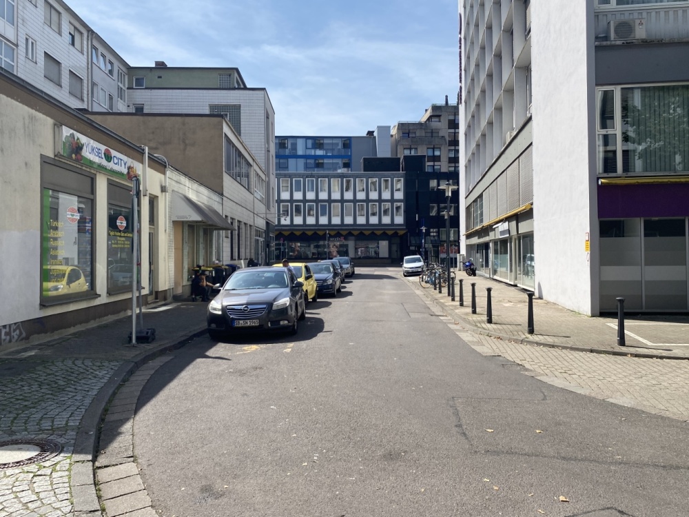 Insgesamt weist die Straßenraumgestaltung jedoch einen eher unbefriedigenden Zustand auf, der durch parkende Autos und technische Einrichtungen (wie Poller, Schranken und ähnliches) geprägt wird. Auch der Durchgang zur Viktoriastraße im Kurvenbereich wirkt nicht gerade einladend. Es herrscht ein Hinterhof-Charakter.